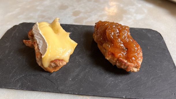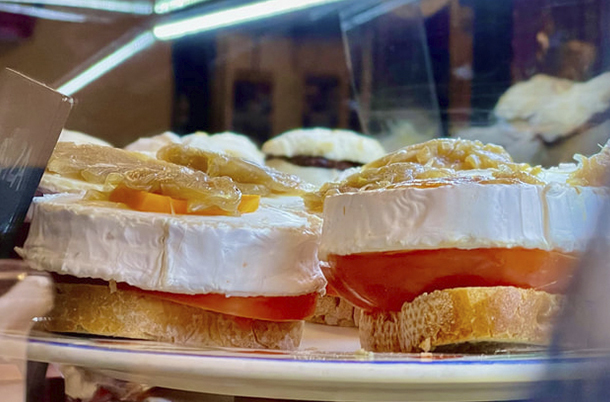 Pincho de pan blanco con cecina de León, pimiento rojo asado y queso de cabra gratinado