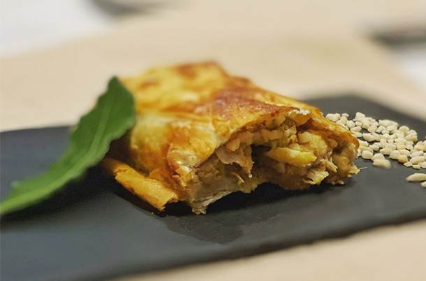 Solomillo de ternera macerado con vinagre de frambuesas y envuelto en hoja de repollo.