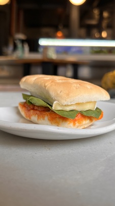 Pan de chapata relleno de chistorra a la plancha y queos brie