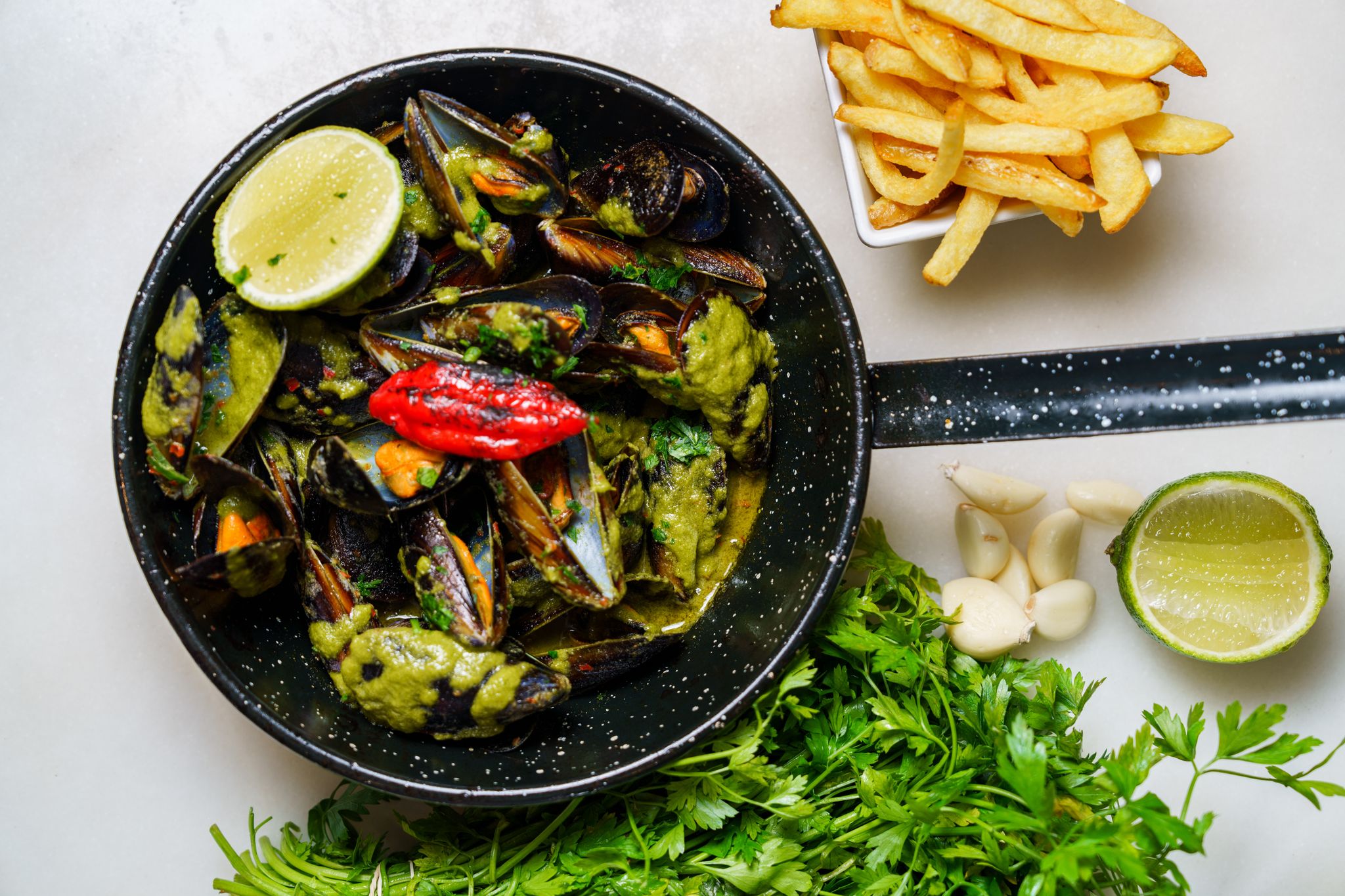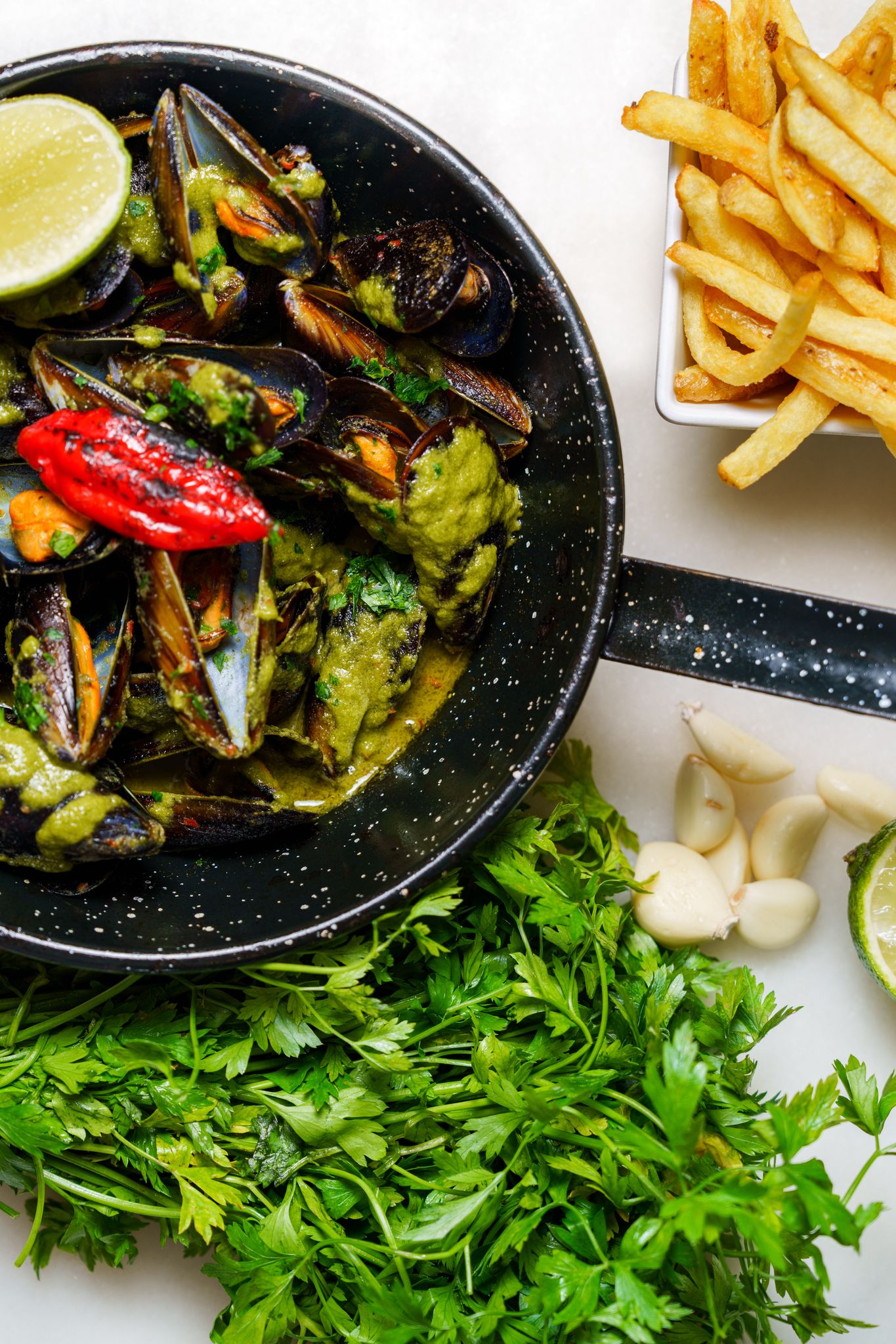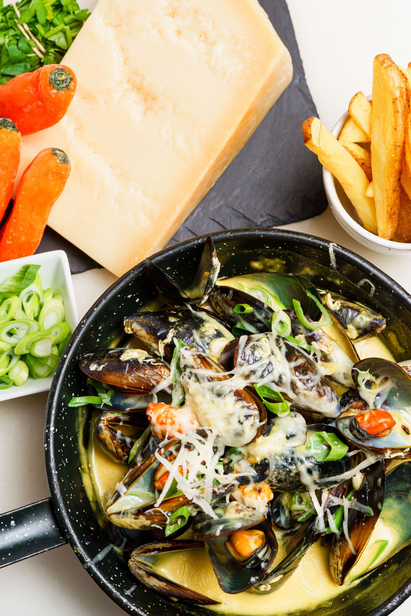 Artisan bread, mussel, melted cheese, arugula and pickled mayonnaise accompanied by french fries.