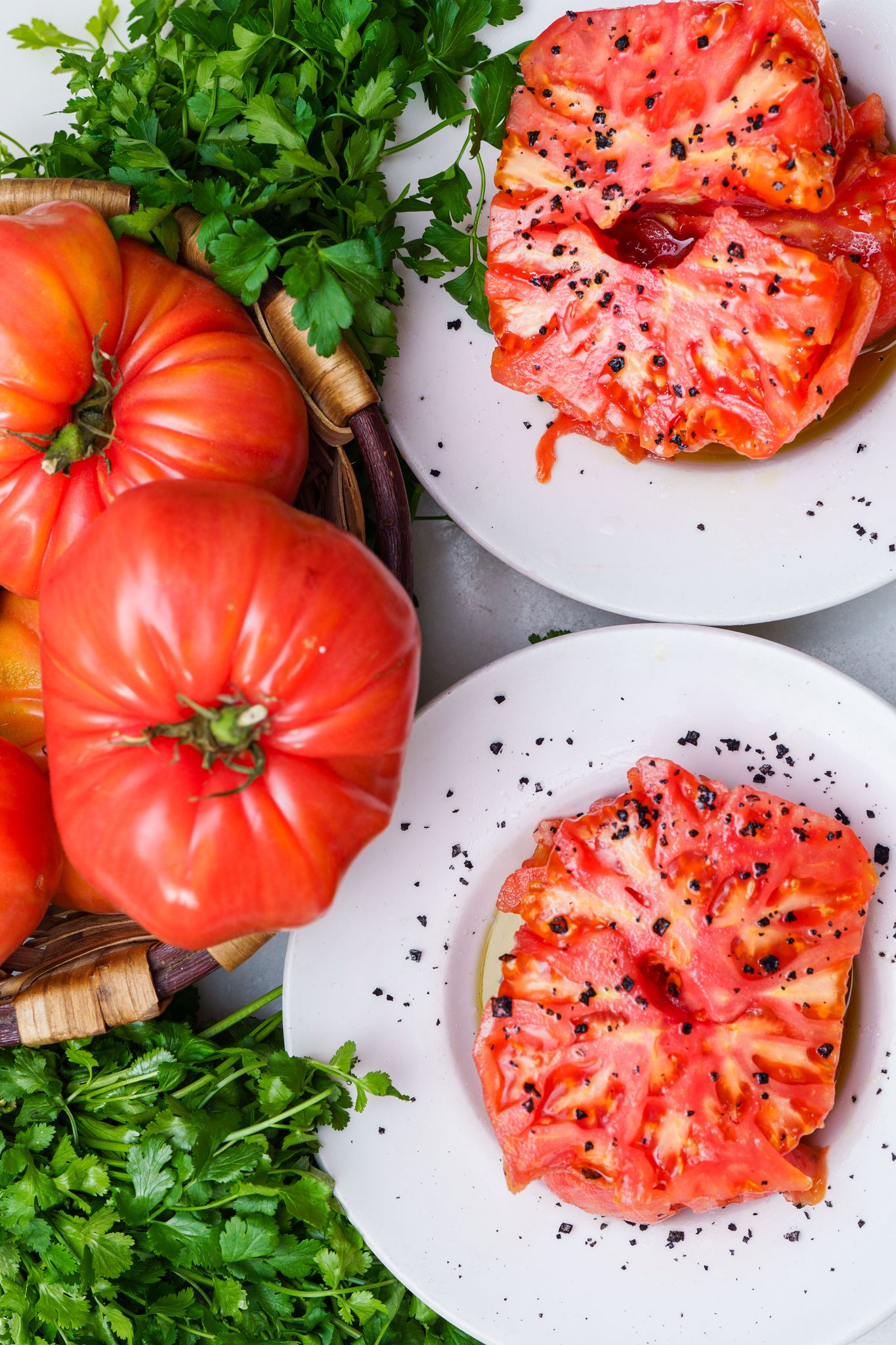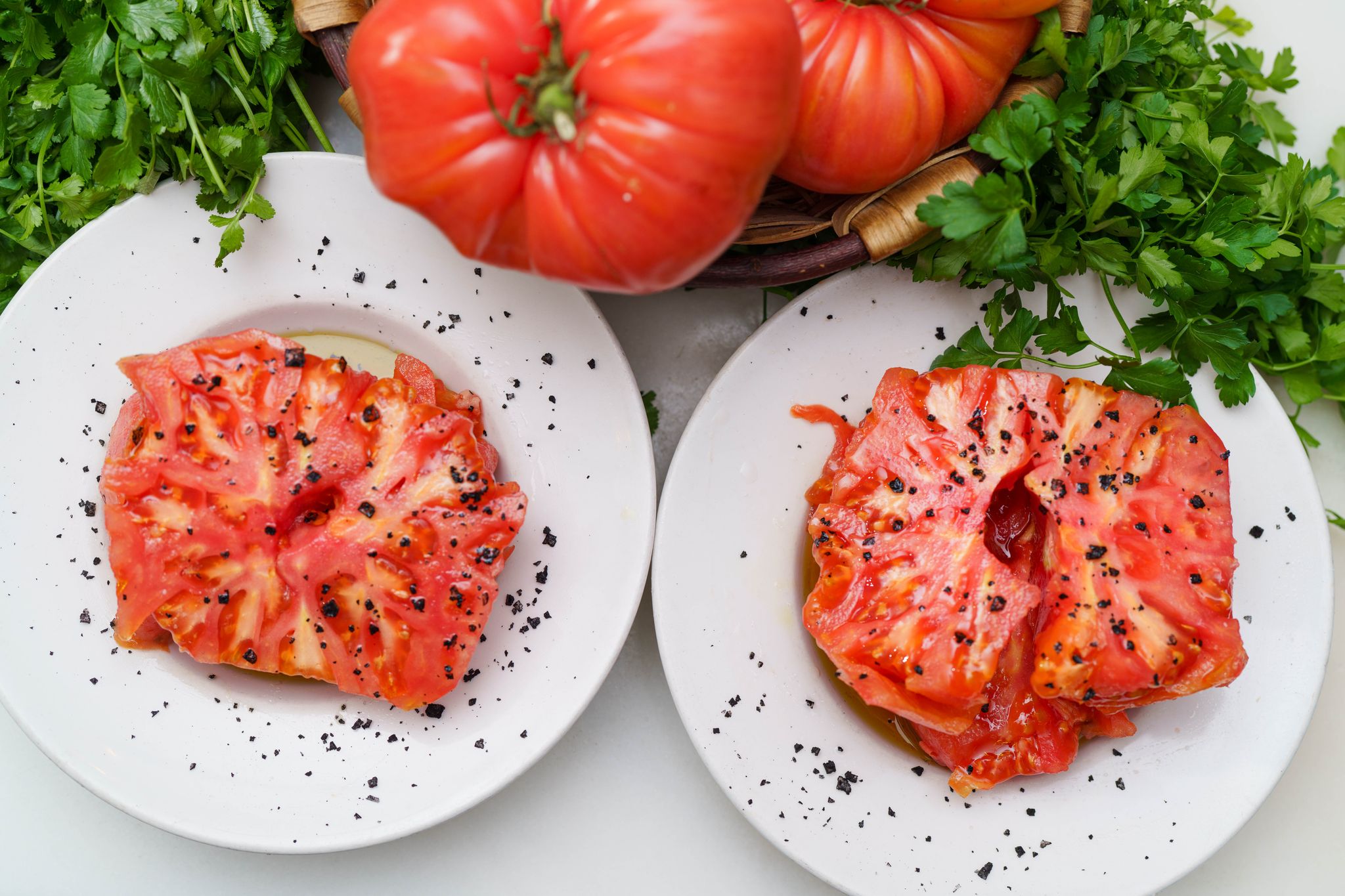 Pink tomato with our sweet vinaigrette and black salt. M: 10,00€ // R: 17,00€.