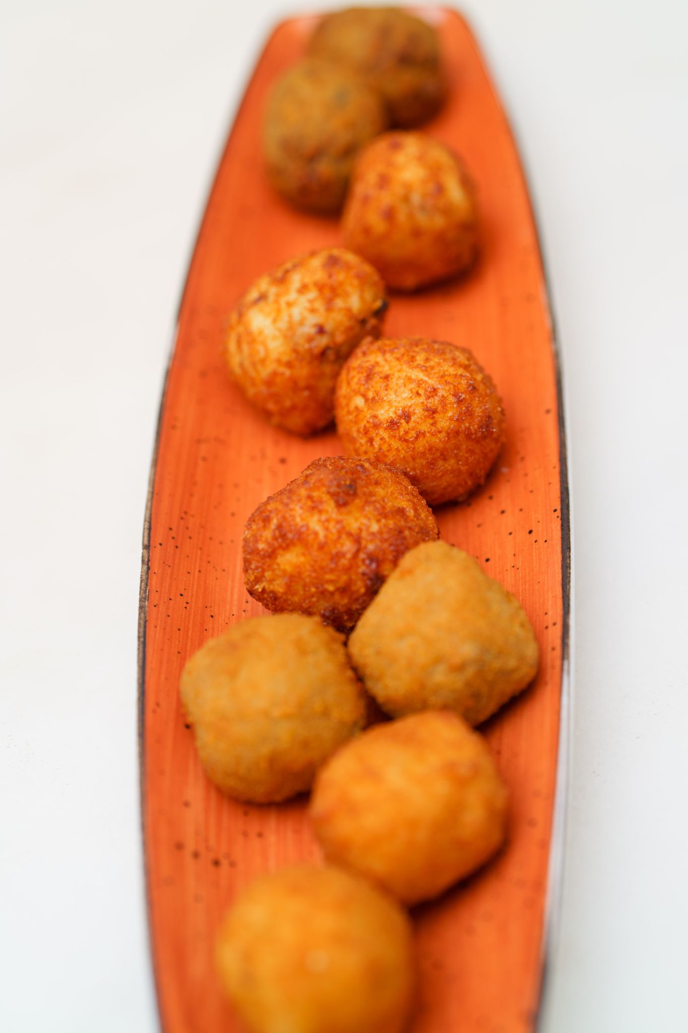 Iberian ham, tail, prawns with truffle and Gamonéu bone. M (4 units): 9,00€ / R (8 units): 18,00€.