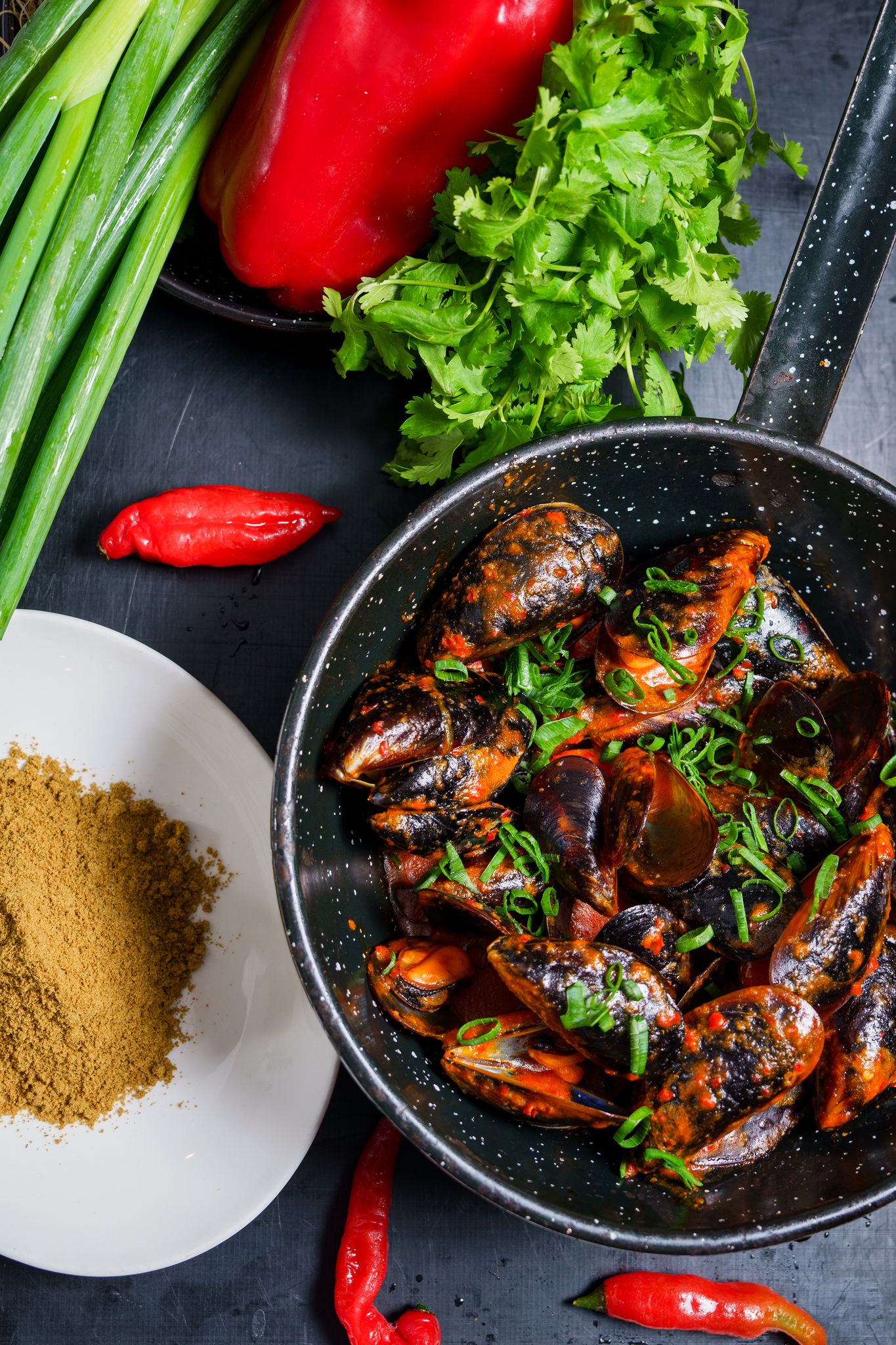 With coconut milk, ginger, kefir lime leaves and green curry.