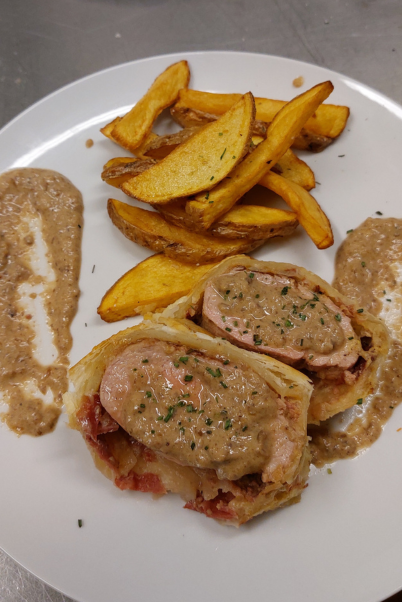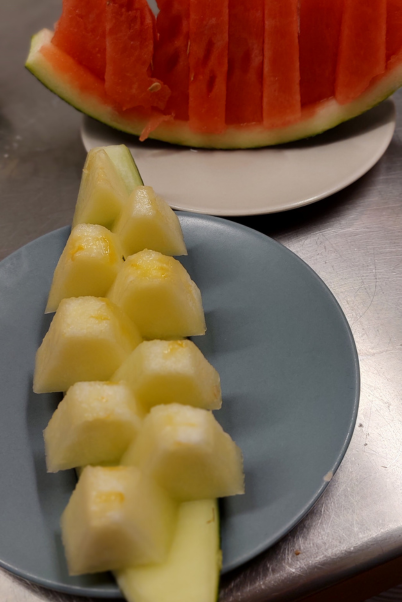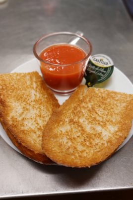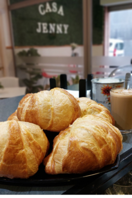 (Jamón york y queso con rebanadas de pan de molde ó Croissant), café ó infusión