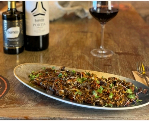 Cachopín de vaca madurada al cabrales con pimientos de piqilllo