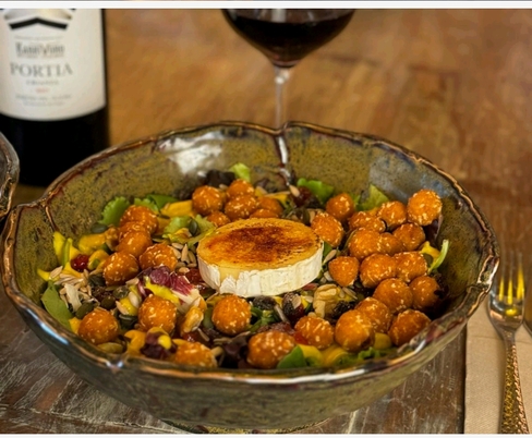 Mezclún con romana, pops de pollo, rulo de queso de cabra braseado, pimiento endulzado, frutos secos y nuestra salsa curry suave