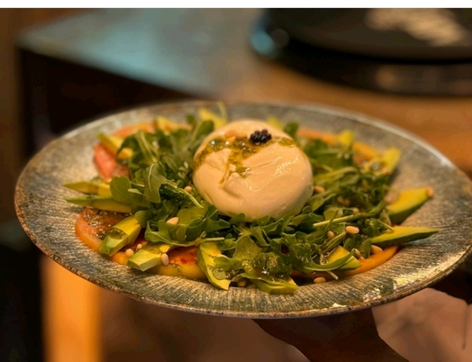 Espectacular Burrata de 250gr ,Lámina de aguacate, tomate del terreno y nuestra salsa albahaca casera
